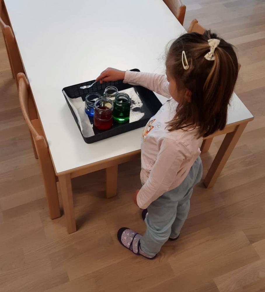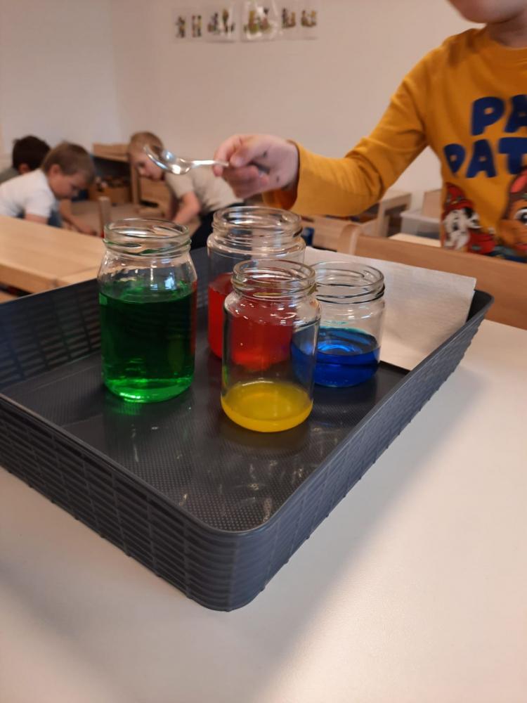 Außerdem haben wir das Wasser als Musikinstrument entdeckt. Verschiedene Klänge wurden erzeugt, indem die Kinder das Wasser zuerst einfärbten und dann mit einem Löffel die verschiedenen Klänge ausprobierten und hörten. Wasser unser Superheld als Musikinstrument.