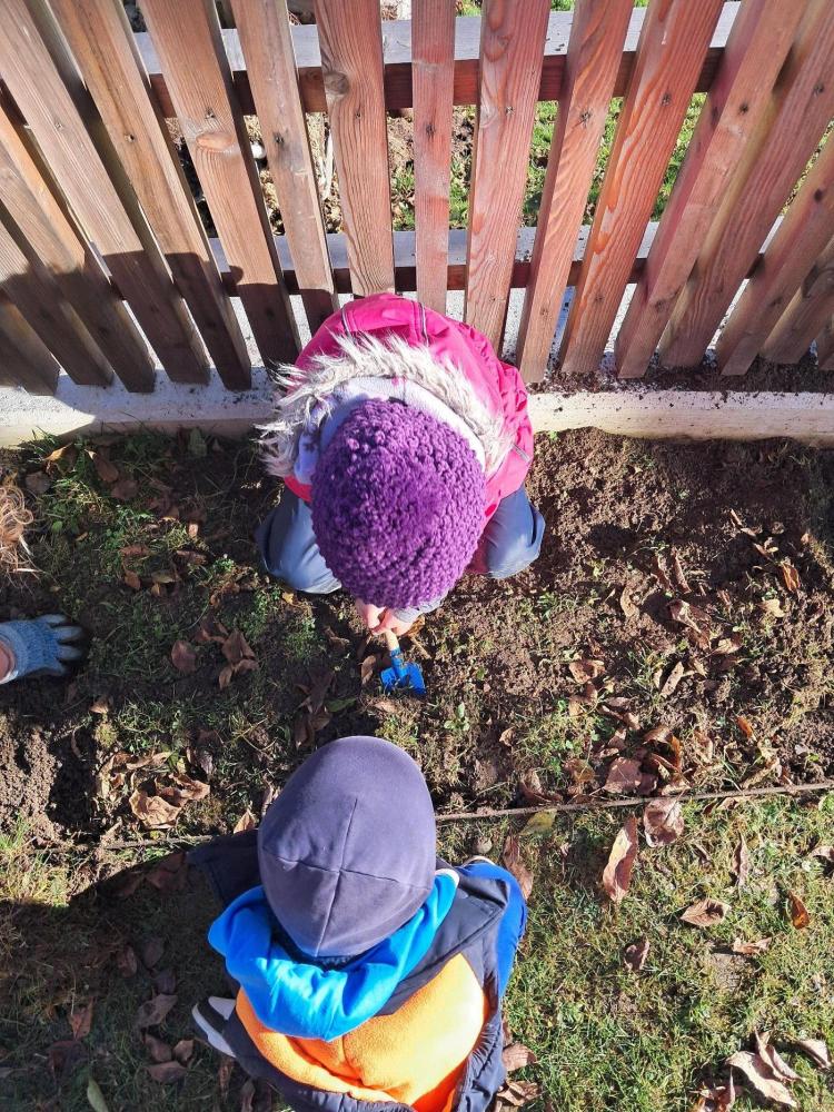 Vorbereitung für den Frühling Wir nutzten das gute Wetter im Herbst, um unseren Garten etwas auf Vordermann zu bringen. Die Bodenbeete wurden von Gras und Unkraut befreit. Hierbei haben uns die Kinder fest unterstützt. Im Frühling können wir so dann neue Pflanzen setzen.